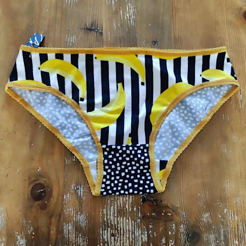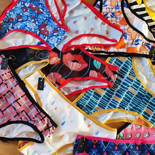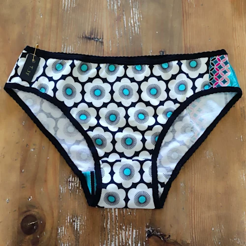Tu as la possibilité d'acheter un kit prêt à coudre, si tu as envie de t'essayer à la couture d'une culotte, et pourquoi pas, la reproduire autant que tu veux. Voici une petite pochette contenant tout ce qu'il faut; un tuto, du tissu déjà découpé, et des élastiques. Elles vont du 34 au 46. Si tu as besoin d'une autre taille, fais moi signe ! Un petit témoin de tissus est agrafé à l'extérieur pour t'aider à choisir.