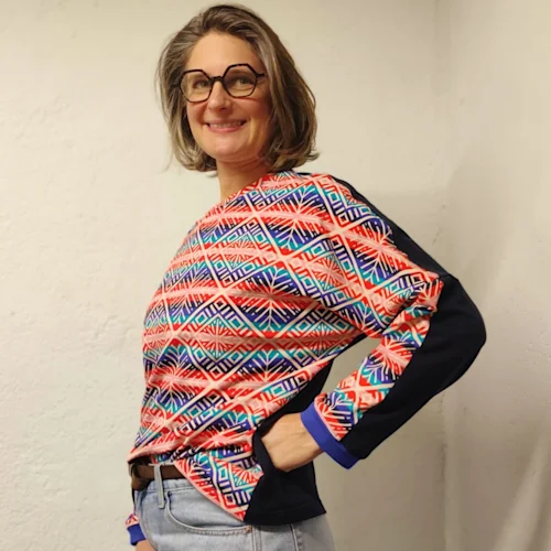 Le sweat raglan est parfait pour combiner plusieurs tissus, car les manches viennent s'insérer sur l'encolure en dessinant une belle pointe sur le devant et le dos du vêtement. On peut rester sage en choisissant un seul et même tissu pour le tout, et on obtiendra un sweat élégant.On peut s'encanailler en optant pour des bordures de manches, encolure et bande du bas dans un tissu contrastant. On peut franchement oser l'association pétaradante de deux tissus assortis, avec en prime des bordures colorées... ou pas ? Ou placerez-vous vos envies sur le baromètre de l'audace? Supplément Jacquard: +5 euros
