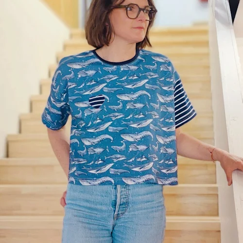 Voici le jeune cousin du "chauve-souris", encore plus ample, car lui n'est pas resserré au niveau des bras. Une coupe oversize, confortable, réconfortante, sans bracelets de manches ni bande en bas, une coupe simple, fluide, régressive. C'est un t-shirt taille semi-unique car je peux faire varier la longueur du buste et des manches. On peut la jouer "pile et face", en optant pour des manches bicolores, en deux parties, avec une couture reliant le poignet à l'épaule, qui elle est volontairement tombante.