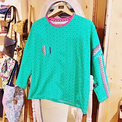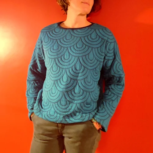 Voici le jeune cousin du "chauve-souris", encore plus ample, car lui n'est pas resserré au niveau des bras. Une coupe oversize, confortable, réconfortante, sans bracelets de manches ni bande en bas, une coupe simple, fluide, régressive. C'est un sweat taille semi-unique car je peux faire varier la longueur du buste et des manches. On peut la jouer "pile et face", en optant pour des manches bicolores, en deux parties, avec une couture reliant le poignet à l'épaule, qui elle est volontairement tombante.